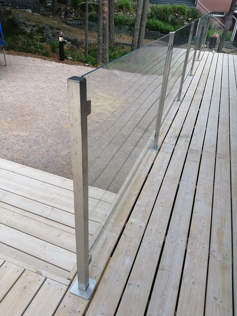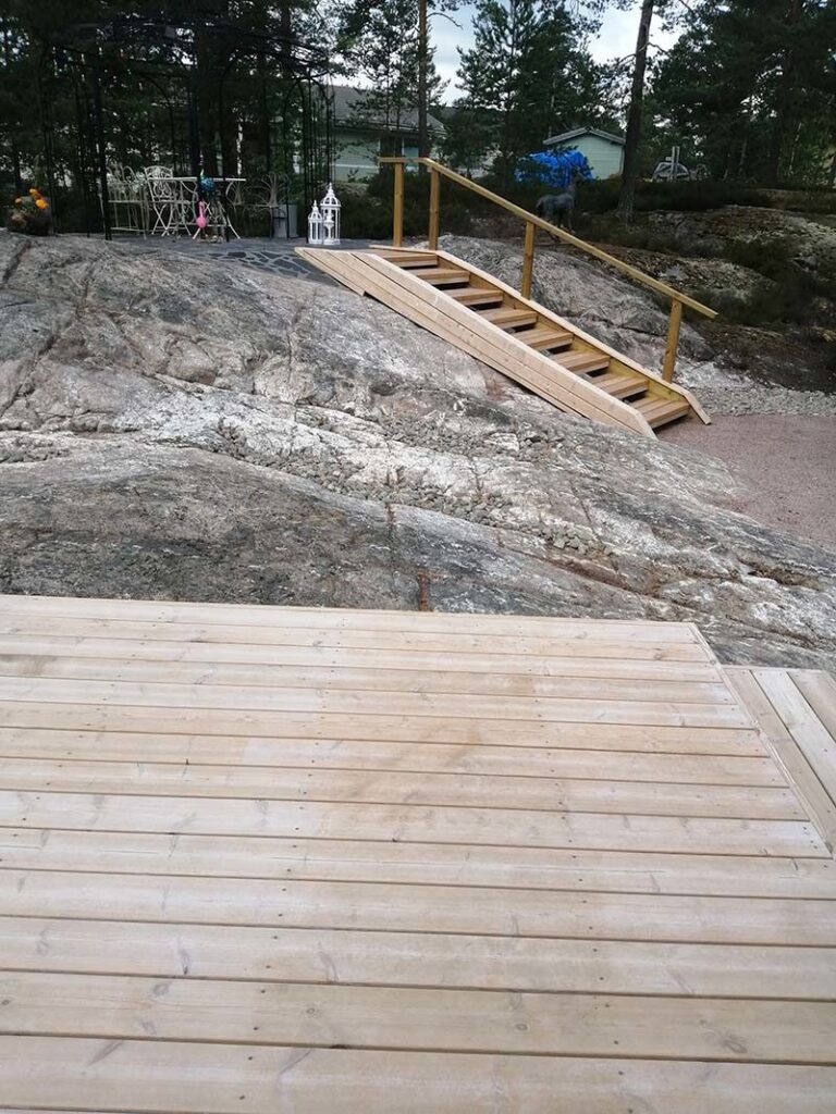 Pihaan rakennettiin isot puuterassit lasikaiteilla. Takapihan kallio putsattiin näkyviin ja sen päälle rakennettiin liuskekivellä oleskelualue ( puuportaat johtavat sinne).
