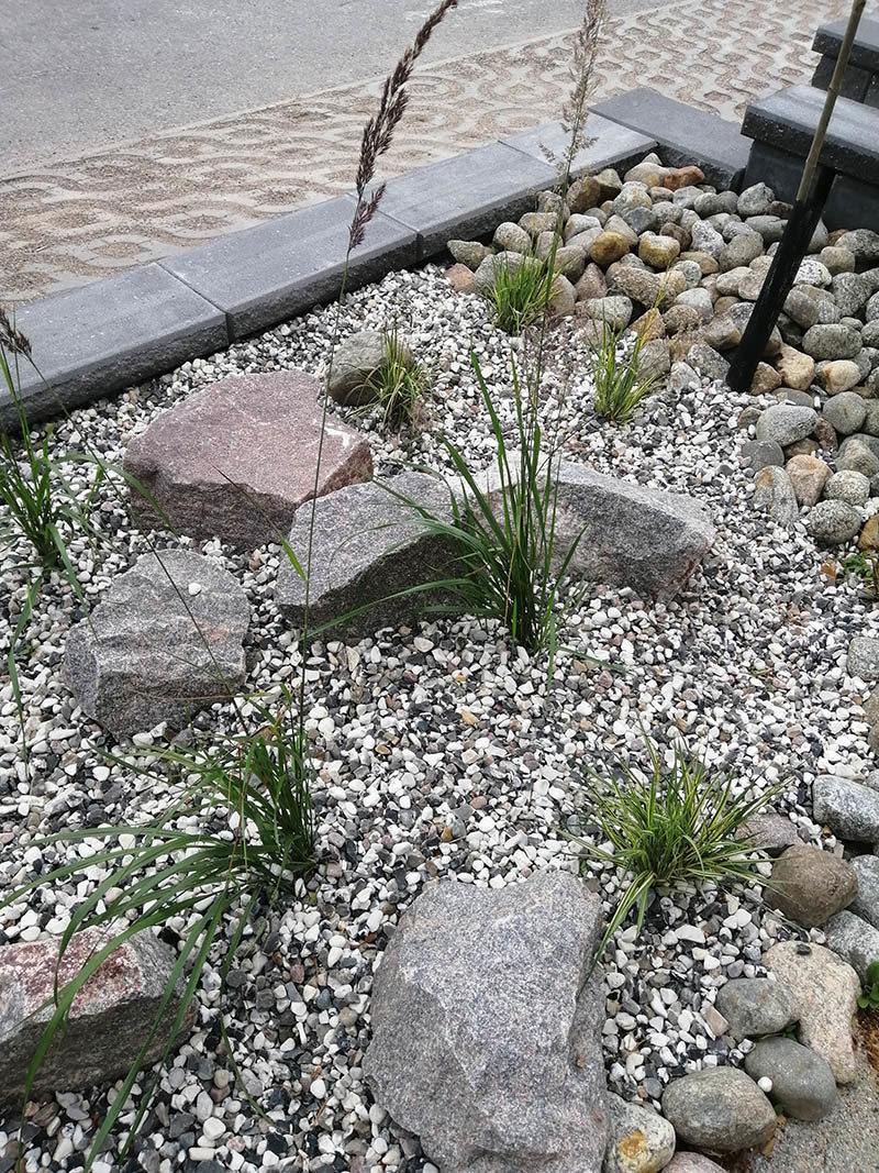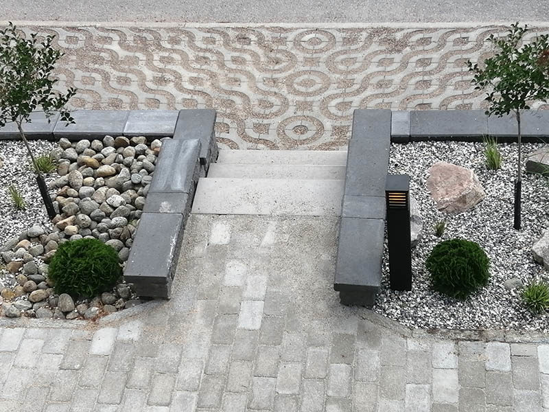 Etupihalle asennettiin muurit ja kaikki kulkuväylät kivetettiin. Istutusalueet tehtiin selkeiksi ryhmiksi.